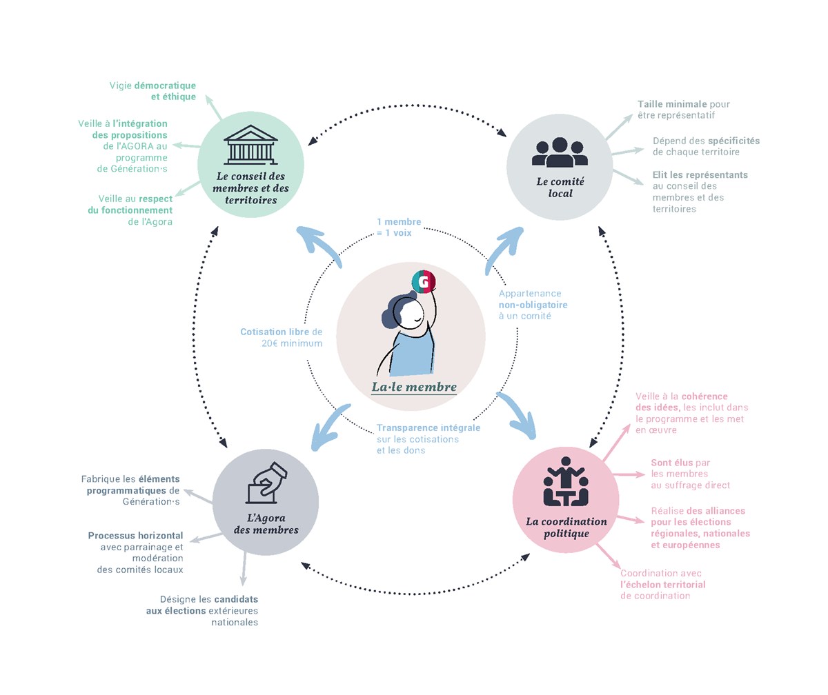 Un organigramme dont évidemment le membre est au centre ! Pouvant appartenir à un comité local, cellule territoriale clé, il est partie prenante de l’agora, la fabrique des idées de Générations-s. Il constitue par suffrage direct la coordination politique. Nous créons un conseil des membres et des territoires, une vigie démocratique et éthique. Il veille au fonctionnement démocratique et au respect des décisions de l’agora. Nous proposons que l’agora soit le cœur du mouvement dont tous les organes dépendent.